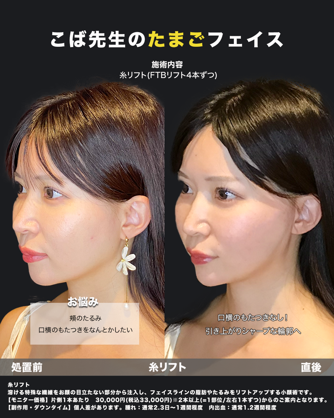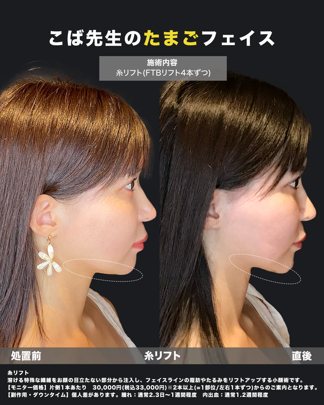 福岡天神美容クリニックで行った、**糸リフト(FTBリフト)**の症例です。両側に3本ずつ特殊なリフト糸を挿入し、フェイスラインのたるみをしっかり引き上げています。