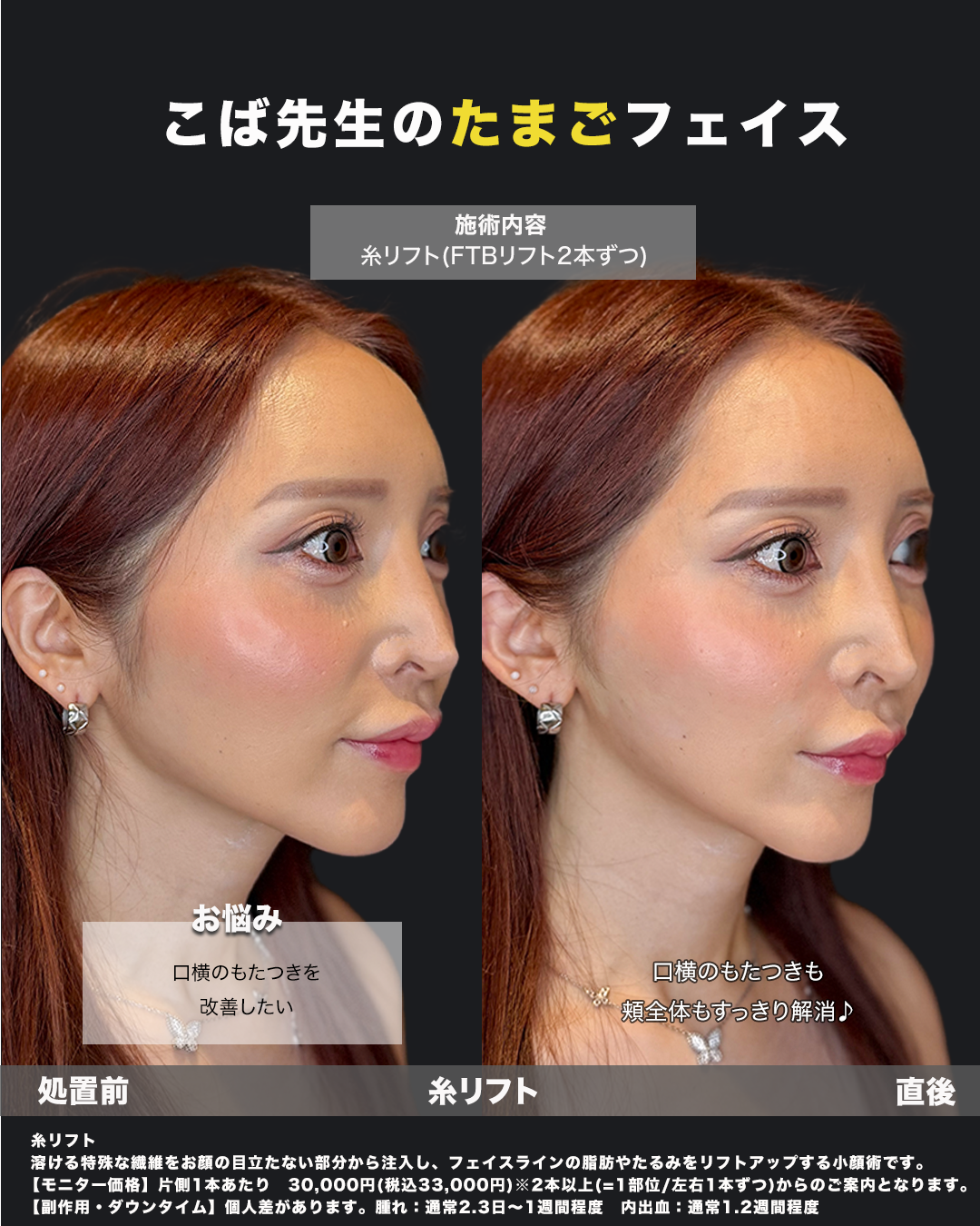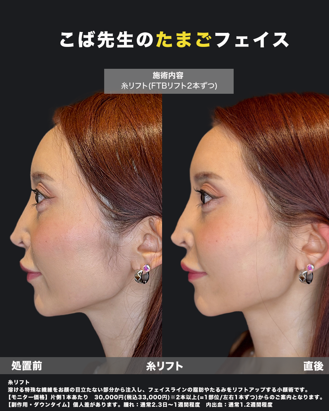 福岡天神美容クリニックで行った、**糸リフト(FTBリフト)**の症例です。両側に特殊なリフト糸を挿入し、フェイスラインのたるみをしっかり引き上げています。