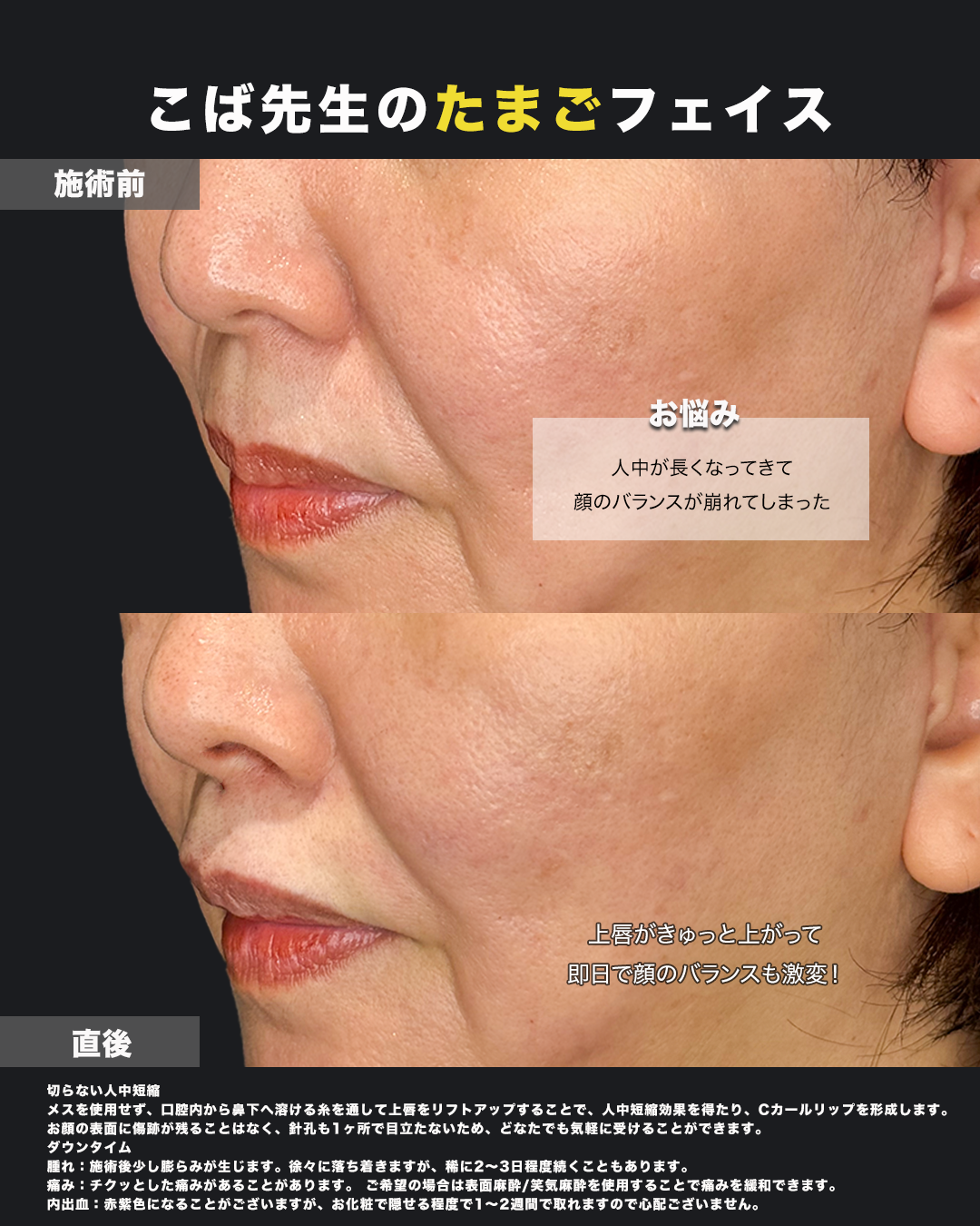 手術直後から人中が短くなり、上唇〜鼻下のバランスが整いました。切らない施術のため傷跡はゼロ。ダウンタイムもほぼなく、自然な仕上がりながらしっかり変化が感じられます。