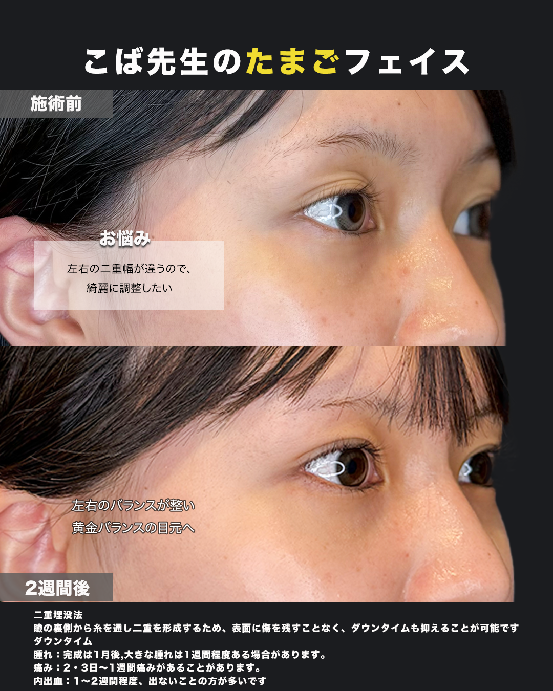 まだ2週間ですが、二重ラインがくっきり腫れもぐっと落ち着いて、理想の目元に近づきました。メイクもしやすくなって、毎日鏡を見るのが楽しいです