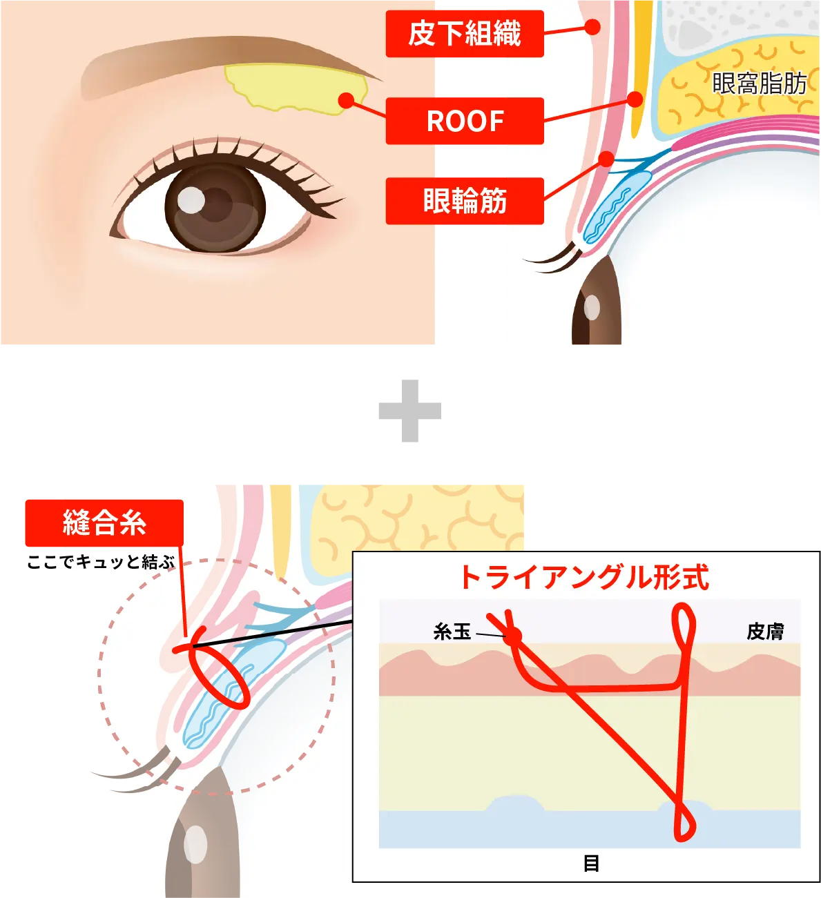 ただし挙筋組織は強く縛れない為、瞼板法点留めに比べてやや固定力が劣ります。もともとまぶたの皮膚が薄い方やすでに二重の癖がついている方におすすめです。