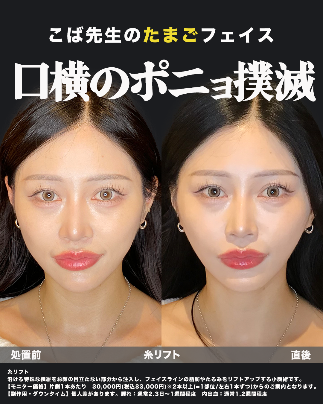 両側に特殊なリフト糸を挿入し、フェイスラインのたるみをしっかり引き上げています。